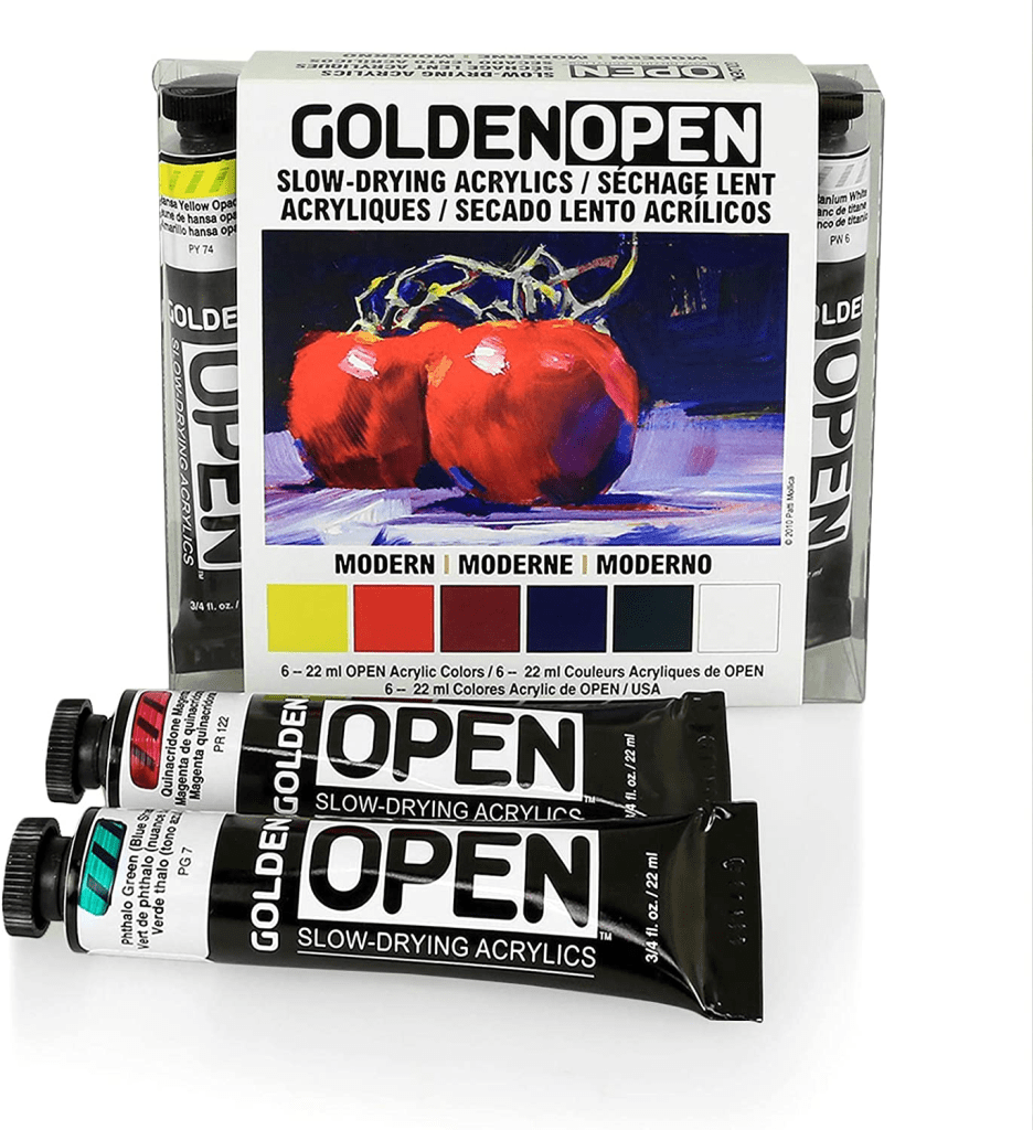 | Golden Open is my favorite acrylic paint, a hybrid really. Can be mixed with any other acrylic paints. The drying time is slowed to give more time for blending and this paint offers a beautiful jewel tone sheen – more like oil paint. This is the perfect starter kit to see if you like it. This kit works with the heavy body acrylics already in your kit. | ![]() |